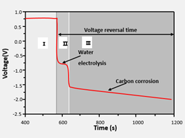 陽極整體缺氣時,優先發生水電解,當陽極可利用的水或者OER催化劑活性降低時,碳腐蝕反應會顯著加速以維持電池的電荷平衡,陽極的電池不斷提高,進一步加速碳腐蝕,反極電壓也會不斷提高。