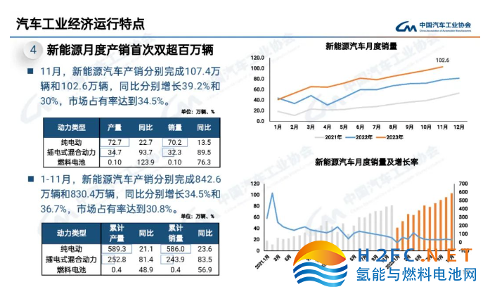 2023年12月11日,中汽協會發布2023年11月汽車工業經濟運行情況。其中,2023年11月燃料電池汽車產銷均完成1000輛,同比分別增長123.9%和76.3%。1-11月,燃料電池汽車產銷均完成0.4萬輛,同比分別增長48.9%和56.9%。