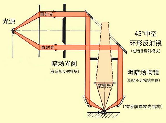 反射暗場光路原理跟透射暗場光路一致,只是結構有些變化,除了多了個環形反射鏡產生反射照明,其物鏡前端也有特殊的反射結構來反射聚光,這種物鏡就是BD明暗場物鏡。