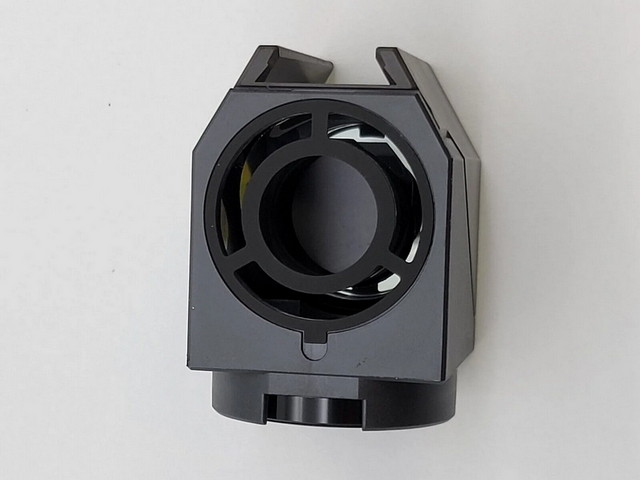 反射暗場必須搭配金相明暗場物鏡。金相明暗場物鏡要比普通物鏡粗很多,因為在金相反射暗場中,暗場照明光線并不通過物鏡聚焦到樣品上,物鏡主體以外要留出一圈空間給暗場照明的光通過,另外物鏡前端可以看到外殼是明顯向前端延申的,以讓暗場照明光傾斜反射到樣品上,在到達前端反射前,會有一圈環形的透鏡或棱鏡對光線進行調整。