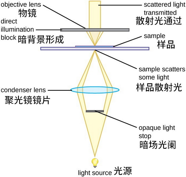 暗場成像原理簡單,擋住直射光,只讓傾斜光照明樣品,樣品產生散射光,然后散射光通過物鏡成像。相比透射明場光路,透射暗場只是在光源到聚光鏡鏡片之間加入了暗場光闌,來擋住光源中間的直射光,形成傾斜光照明樣品。
