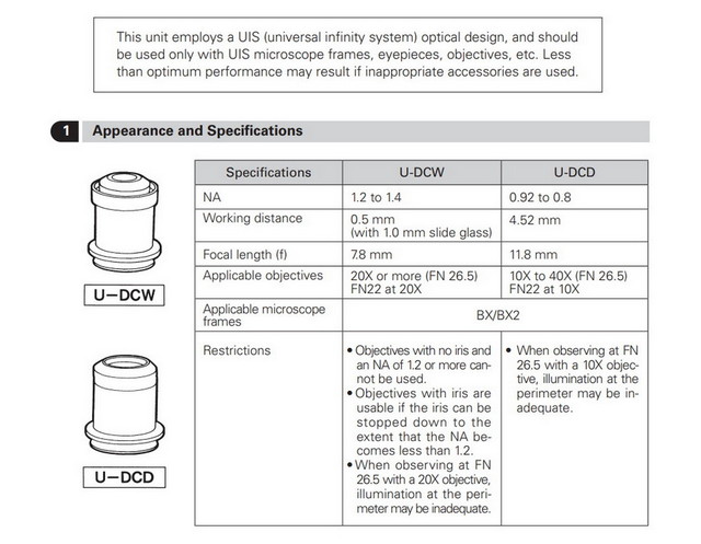 專業的暗場聚光鏡有很多種,特點是特殊結構,帶來特別高的N.A.以UIS系統的U-DCW油浸式暗場聚光鏡為例,其照明N.A可以到1.2-1.4,可以使用20X以上,N.A1.2以下的高倍物鏡。這種聚光鏡使用比較費工夫,需要對中,并且滴油時不能有氣泡,否則暗場效果不佳。