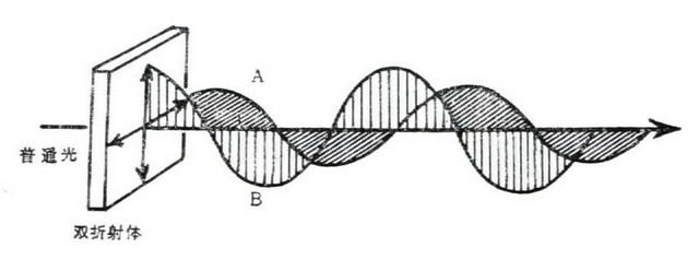 晶體在光學性質上具有雙折射性,也稱各向異性,即光線在通過晶體時,分解成兩種振動方向互相垂直且傳播速度不等的偏光,如上圖光經過晶體(雙折射體)后,被分解成A光和B光兩個偏振光,他們方向相互垂直,但相位不同,其差異與雙折射體厚度相關。