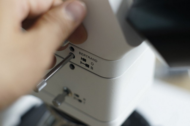 ④勃氏鏡(Bertrand Lens):勃特蘭透鏡在錐光觀察時使用,用于形成干涉圖,干涉圖的形態因晶體的光性和切片方向而不同,可借以鑒別晶體的軸性、切片類型、光性符號等屬性。必須搭配無應力物鏡使用。