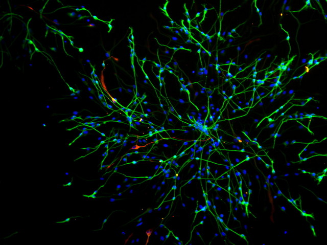 倒置熒光顯微鏡MF52-N拍攝的多色熒光標記的神經細胞
