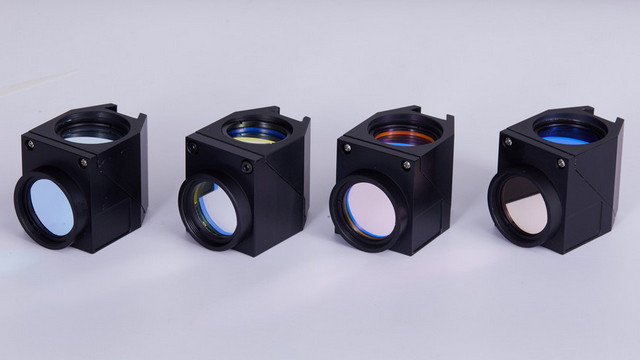 ②熒光激發塊:一組激發塊由激發濾光片、發射濾光片和二向分光鏡組成,一臺熒光顯微鏡可能有多組激發塊,作用是篩選特定的激發光和發射光,透過目標熒光信號。核心規格是光譜波長參數,其波長參數與熒光染料匹配度會影響熒光觀察效果,匹配不佳會帶來更多背景雜訊、更低的信噪比。