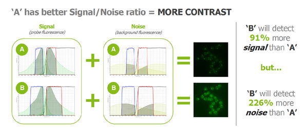 使用帶通濾光片可以獲得相對更高信噪比的熒光成像,而不同參數的帶通濾光片,會對成像效果有重大影響,比如下圖A和B兩組帶通濾光片,A組濾光片是窄帶,搭配比B組能多檢測出90%的有用信號,減少200%的背景干擾信號,在圖像上表現為A組信號更清晰透亮。此外,由于技術水平問題,國內窄帶濾光片的截止深度(OD)要比進口差,光譜表現為光通效率到邊緣“緩坡下降”而不是“斷崖下降”,最終成像效果不如進口窄帶,單要稍優于普通帶通。