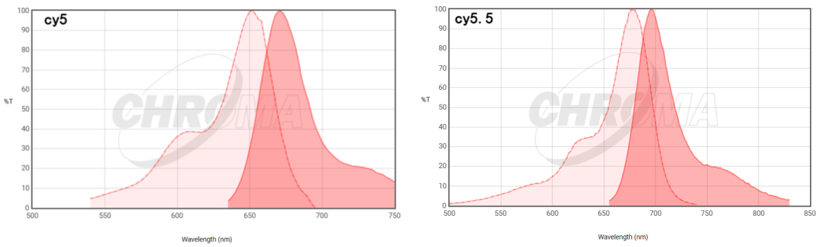 花氰染料cy5/cy5.5常用于生物分子標記,在熒光顯微成像、流式細胞儀分析、小動物活體標記成像中均有廣泛使用。Cy5最大激發波長一般在649nm,最大發射波長一般在670nm;cy5.5最大激發波長一般在673nm,最大發射波長一般在695nm。其激發特征在近紅外(紅外)譜段,且激發和發射波長半高寬(特征譜線中峰值一半對應的波長寬度)較窄,對濾光片組的選擇要求較高,否則熒光信號較弱或無法捕獲熒光信號。