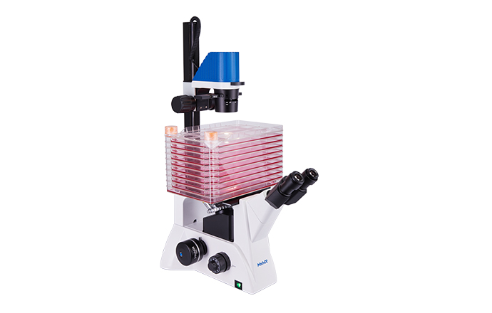 還有一種比較少見,但也有可能的應用,是觀察10層細胞工廠培養皿,由于這種培養皿比較大,一般的熒光顯微鏡會有不便,建議使用的儀器是10層細胞工廠顯微鏡MI52-CF,聚光鏡可以調高以支持10層細胞工廠,然后熒光觀察可以通過擴展數顯LED熒光模塊實現。