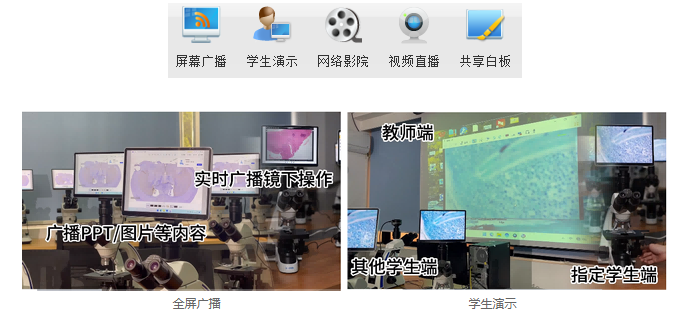 明美數碼顯微鏡互動教學系統可以通過“屏幕廣播”將教師端的示教的標本或其他教學內容同步實時地廣播給學生;或者可以通過“學生演示”功能將某個學生端的標本圖像廣播給其他學生;亦可以打開“共享白板”,讓教師與學生能夠在同一個白板上編輯操作,實現示教內容的高度統一,使學生能夠在有限的實驗時間內掌握大量的知識。