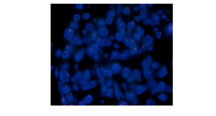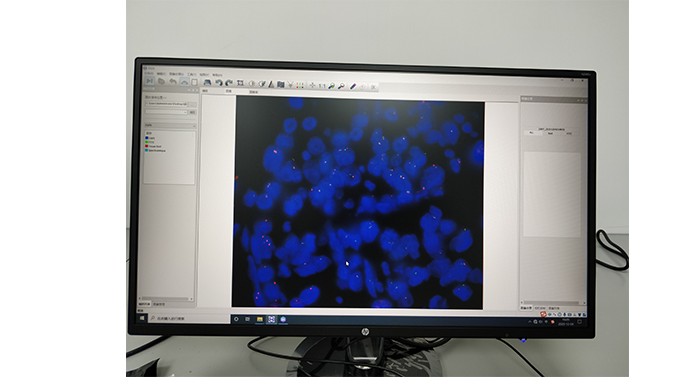 深圳禾正醫(yī)院的老師采用了明美的MFISH熒光原位雜交分析系統(tǒng),檢測(cè)中用her2/cep17的比值來(lái)測(cè)定是否有此原癌基因擴(kuò)增,當(dāng)HER2/CEP17比值≥2.0時(shí),為HER2陽(yáng)性;此外老師還定制了雙通道熒光模塊,可以同時(shí)在目鏡下觀察到紅綠兩種顏色的信號(hào)點(diǎn),大大提高科室的工作效率。