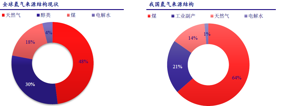 目前,全球制氫技術(shù)的主流選擇是化石能源制氫,主要是由于化石能源制氫的成本較低 ,其中天然氣重整制氫由于清潔性好、效率高、成本相對較低,占到全球 48% 。我國能源結(jié)構(gòu)的特點是“富煤少氣”,煤制氫成本要低于天然氣制氫,因而國內(nèi)煤制氫占比最大(64%),其次為工業(yè)副產(chǎn)(21%)。