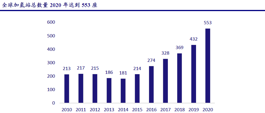 自2014年以來,全球加氫站的數(shù)量不斷增長,到 2020年底達到了553站。