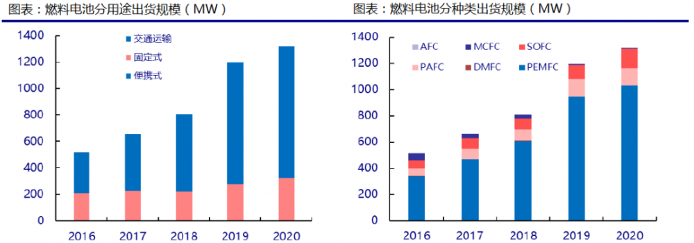 全球燃料電池市場潛力大,其中交通運輸類燃料電池將成為增長主力。根據(jù) E4tech發(fā)布的 2020 燃料電池產(chǎn)業(yè)回顧, 2020 年全球燃料電池出貨量 1318.7MW 市場規(guī)模 42 億美元 。按用途劃分,交通運輸類出貨量 993.5MW ,占比 75.3%;按種類劃分, PEMFC 出貨量 1029.7MW ,占比 78.1%。長期來看,燃料電池汽車仍將是燃料電池市場的增長主力。據(jù)預(yù)測, 2020-2025 年全球燃料電池市場 年復(fù)合增長16.64%, 2025 年將達到 90.5 億美元。