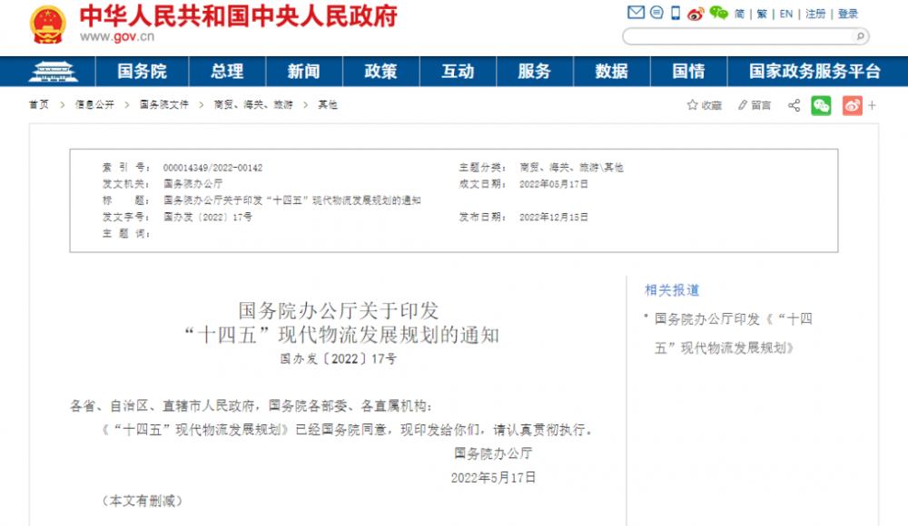 12月15日,國務院辦公廳印發《“十四五”現代物流發展規劃》(以下簡稱《物流規劃》)的通知。
