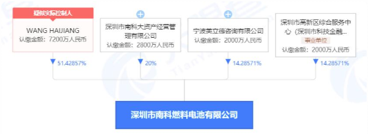 資料顯示,深圳市南科燃料電池有限公司是公司主營業務是燃料電池電堆、膜電極、雙極板研發生產銷售,由加拿大國家科學院王海江院士團隊、南方科技大學、深圳市政府、正道產業投資集團于 2016 年 6 月合資設立。正道集團的全資控股子公司寧波美立德咨詢有限公司曾出資 2000 萬元、持股 14.2857%。