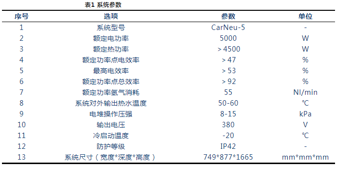 CarNeu-5系統(tǒng)是一款氫燃料電池?zé)犭娐?lián)產(chǎn)設(shè)備,產(chǎn)品通過電化學(xué)反應(yīng),將氫氣和空氣反應(yīng)生成直流電,進(jìn)一步通過電力電子系統(tǒng)逆變?yōu)榻涣麟娝腿腚娋W(wǎng),供用戶使用。產(chǎn)品工作產(chǎn)生的廢熱被回收,以熱水的形式向用戶供應(yīng)。整個(gè)系統(tǒng)發(fā)電功率5000W,采用380V三相交流并網(wǎng),可向外輸出50-60℃熱水,熱功率>4500W,全系統(tǒng)全流程額定凈發(fā)電效率>47%,最高凈發(fā)電效率>53%,系統(tǒng)采用了經(jīng)典的外形設(shè)計(jì),相比較附帶重整系統(tǒng)的H2ES系列產(chǎn)品,體積縮小接近二分之一。系統(tǒng)詳細(xì)參數(shù)如表1所示。