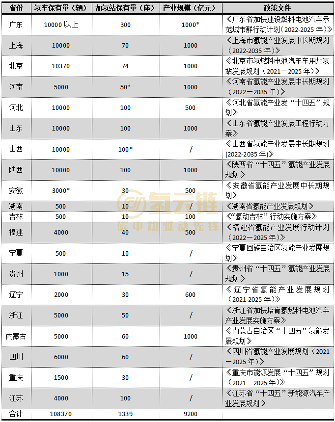 統計說明:各省份均以最新文件統計,帶星號的為估算值,其中加氫站以100輛氫車配1座加氫站的比例估算,廣東省產業規模則根據北京和上海的類比估算,保守估計為1000億。
