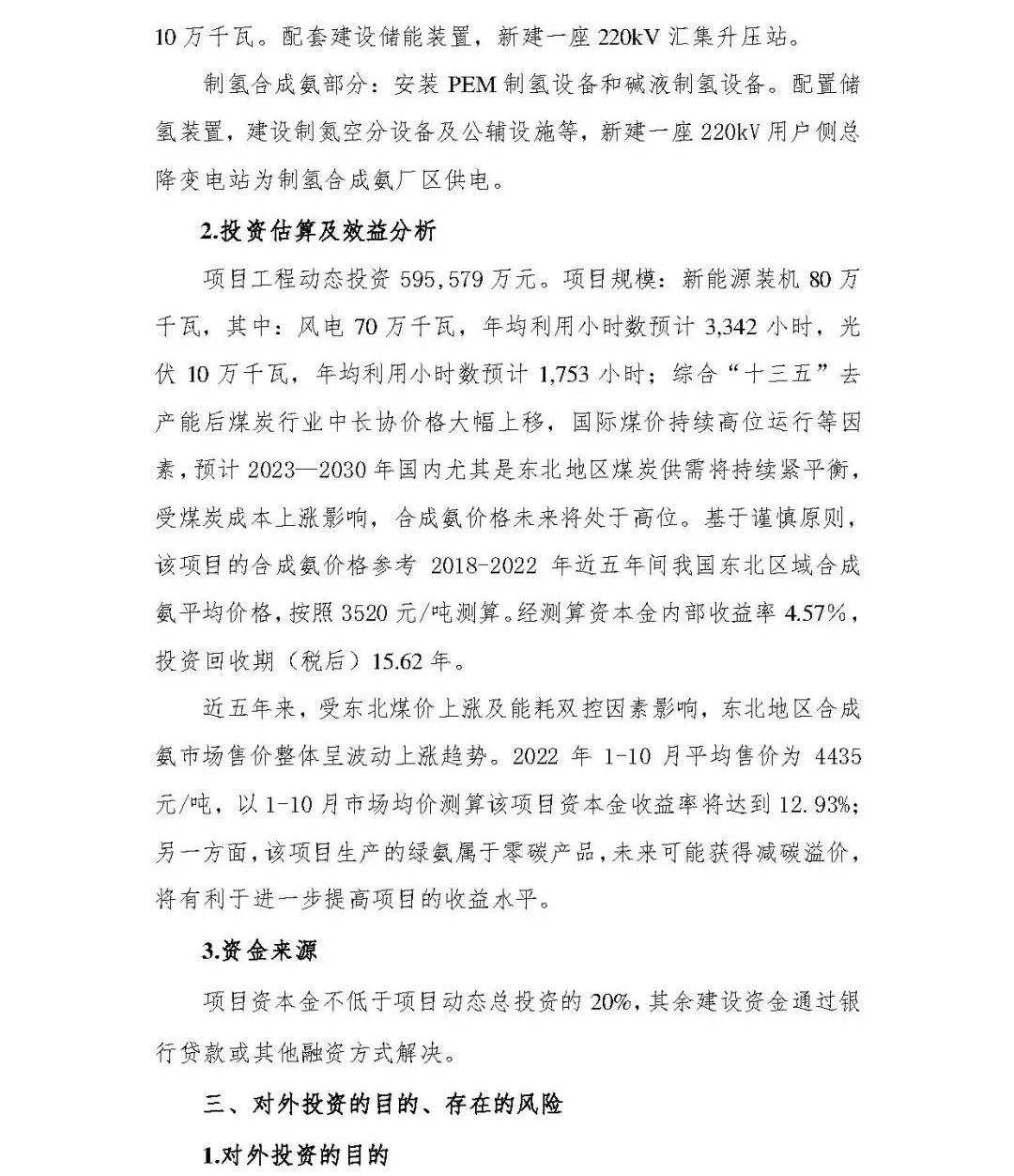 2022年12月30日,吉電股份發(fā)布公告稱,根據(jù)公司發(fā)展戰(zhàn)略,為實現(xiàn)氫能產(chǎn)業(yè)創(chuàng)新,促進公司可持續(xù)發(fā)展,吉電股份全資子公司——大安吉電綠氫能源有限公司擬投資建設大安風光制綠氫合成氨一體化示范項目。項目動態(tài)總投資595,579萬元。制氫合成氨部分:安裝PEM制氫設備和堿液制氫設備。配置儲氫裝置,建設制氮空分設備及公輔設施等,新建一座220kV 用戶側總降變電站為制氫合成氨廠區(qū)供電