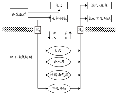 通過(guò)可再生能源發(fā)電并制取氫氣;將氫氣注入鹽穴、枯竭油氣藏、含水層和襯砌的硬巖洞等地下地質(zhì)構(gòu)造中;實(shí)現(xiàn)氫能的儲(chǔ)存;有需要時(shí)可將氫氣從地下儲(chǔ)氫場(chǎng)所采出用于燃?xì)?、發(fā)電或其他用途。