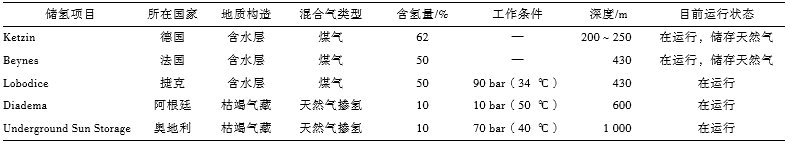1979年美國(guó)天然氣技術(shù)研究院發(fā)表了地下儲(chǔ)氫研究報(bào)告,證實(shí)了其經(jīng)濟(jì)和技術(shù)上的可行性。1986年,根據(jù)Taylor等人研究,地下儲(chǔ)氫是最經(jīng)濟(jì)的儲(chǔ)氫方法。此外表1也展示一些項(xiàng)目研究證明其可行性。