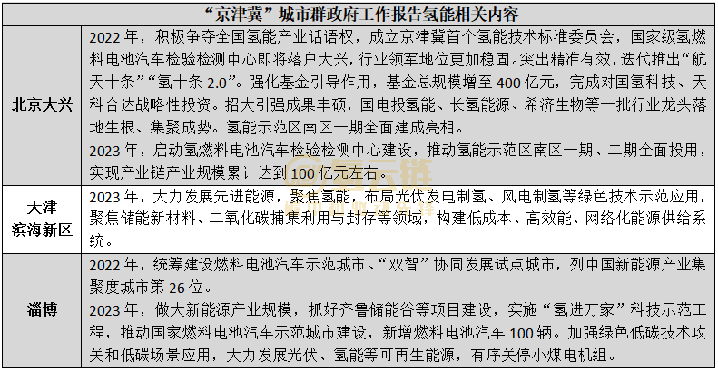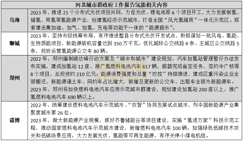 2、由虛向實,氫能規劃目標更詳細。2023年城市群地區的政府工作報告中對于氫能產業的表述更加詳細:基本回顧了2022年氫能產業的建設成績,并提出了2023年對于氫能產業發展的量化指標,如鄭州、開封、淄博、聊城等地計劃推廣910輛以上的氫車,而北京大興區更是明確了2023年氫能產業規模將達到100億元;部分地區更是提出了具體的項目建設目標,如北京大興區指出2023年啟動氫燃料電池汽車檢驗檢測中心建設、洛陽市指出推動氫沄氫燃料發動機項目盡快批量達產等。
