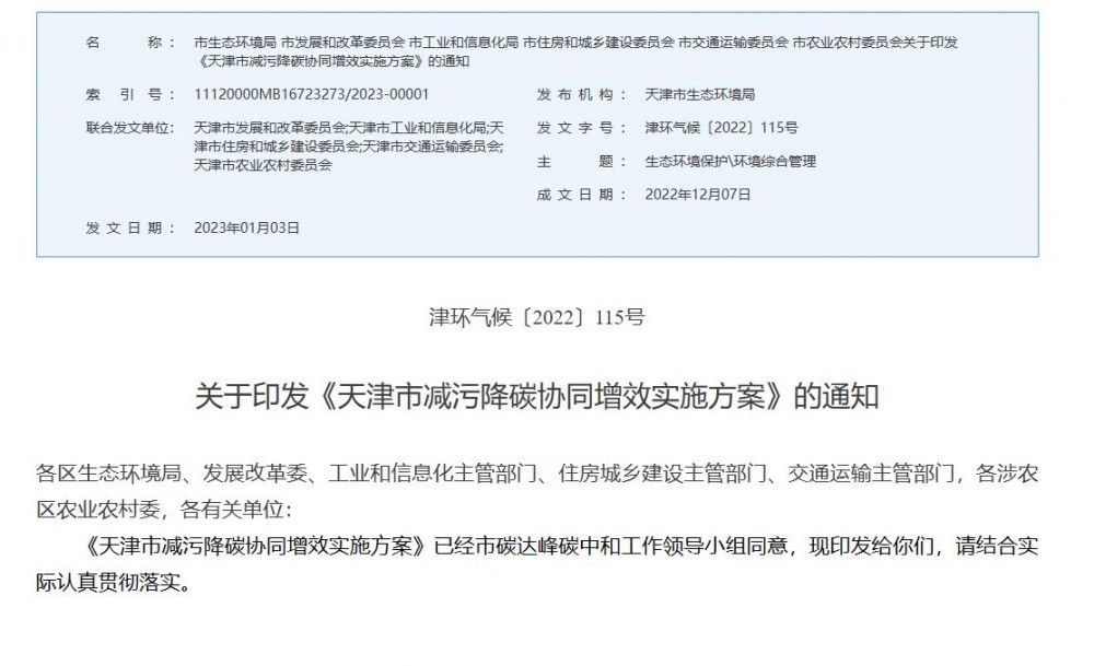 1月3日,天津市生態環境局、市發展改革委、市工業和信息化局、市住房城鄉建設委、市交通運輸委、市農業農村委等6部門聯合印發《天津市減污降碳協同增效實施方案》。