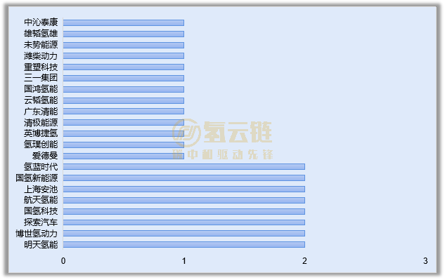 從21家配套企業(yè)來看,集中度非常低,最高僅配套了2款車型。其中明天氫能、博世氫動(dòng)力、探索汽車、國(guó)氫科技、航天氫能、上海安池、國(guó)氫新能源、氫藍(lán)時(shí)代分別以2款并列第一;其余配套商均為1款。(備注:企業(yè)配套總數(shù)均歸到主機(jī)廠)