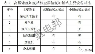 固態金屬儲氫加氫站的工藝設備更簡約,有利于氫產業的商業化推廣。車載金屬儲氫容器工作壓力低于 5 MPa,加氫站可通過拖車和加氫機直接為燃料電池汽車加注,無需增壓,站內儲氫容器的設計壓力也可降低,從而可省去高壓氣態儲氫中最復雜的壓縮機及其高壓儲氫容器。兩者的主要設備對比見表 2。