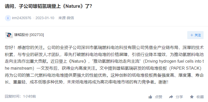 公司回答表示,您好!感謝您的關(guān)注。公司的全資子公司深圳市氫瑞燃料電池科技有限公司憑借全產(chǎn)業(yè)鏈布局,深厚的技術(shù)積累,與專業(yè)的研發(fā)人才團(tuán)隊(duì),率先打破燃料電池電堆的價(jià)格屏障,引領(lǐng)行業(yè)降本增效,為推動(dòng)氫燃料電池走向主流作出重大貢獻(xiàn)。近日登上《Nature》,“推動(dòng)氫燃料電池走向主流”(Driving hydrogen fuel cells into the mainstream)一文發(fā)布后,獲得業(yè)內(nèi)高度關(guān)注。文中提到雄韜氫瑞研發(fā)的紙電堆極板(PAPER STACK)將為公司的第二代燃料電池電堆提供更強(qiáng)大的性能優(yōu)勢(shì)。這種創(chuàng)新的紙電堆極板具備強(qiáng)度高、厚度薄、壽命長(zhǎng)、重量輕、成本低等多種優(yōu)勢(shì),未來紙電堆將成為高功率電堆市場(chǎng)的有力競(jìng)爭(zhēng)者。謝謝!