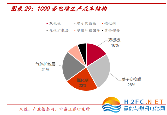 膜電極在電堆成本中占比高達 70%,因此膜電極成本變動對電堆成本來 說非常關鍵。根據中國電動汽車百人會數據,膜電極(催化劑、質子交 換膜、氣體擴散層)生產規模從 100 萬片/年擴大至 1000 萬片/年時候, 生產成本可下降約 43%,占電堆生產成本比例可從 70%降至 57%。