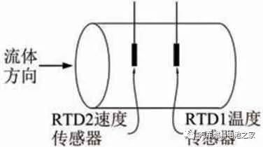 熱擴散式流量計是一種高精度、高可靠性且應用廣泛的流量計。典型傳感元件為2個RTD熱電阻:RTD1為溫度傳感器,測量氣體溫度T1;RTD2為速度傳感器,在氣體原本溫度的基礎上進一步加熱至溫度T2,形成恒溫差ΔT。但氣體流過RTD2時會帶走熱量,為保持ΔT恒定,需要繼續加熱,氣體流速越大,擴散的熱量越多,因此,加熱的電功率與氣體流量成正比。熱式流量計的工作原理如圖2所示。