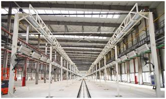 “我們把廠房設計建設成了U型,是考慮到車輛制造流水線作業的流暢性。”劉盛明指著總裝車間兩條高約3米,長約百米的鋼架說,“這是聯合廠房的總裝動力網架。物料從聯合車間的一端進入,在焊裝車間經過車身焊接后,來到涂裝車間進行電泳、涂裝等操作,然后就會送到總裝車間,在總裝動力網架上進行底盤、三電系統、氫系統、氫燃料電池系統、內飾等的裝配。之后,車輛便可以從前方聯合廠房的出口處進入外面的調試車間,經過最后的調試、檢測、路試合格后才能出廠交付。”