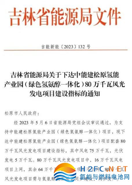日前,吉林省能源局發布關于下達中能建松原氫能產業園(綠色氫氨醇一體化)80萬千瓦風光發電項目建設指標的通知。