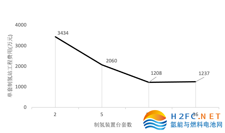 制氫規(guī)模是降低單位投資造價水平的關(guān)鍵,根據(jù)對3個不同等級項目的梳理,選取單套設(shè)備工程費用作為1個評價指標(biāo),單套工程費占總投資的3/4,是能反應(yīng)整體項目投資造價水平的。如圖2所示,當(dāng)設(shè)備達(dá)15套以上時,單套設(shè)備工程費(設(shè)備、建安和土建)趨于平緩,為1200萬元/套;當(dāng)5套時,單套工程費就上升到2000萬元/套;當(dāng)只有1——2套時,上升到3000萬——3500萬元/套。
