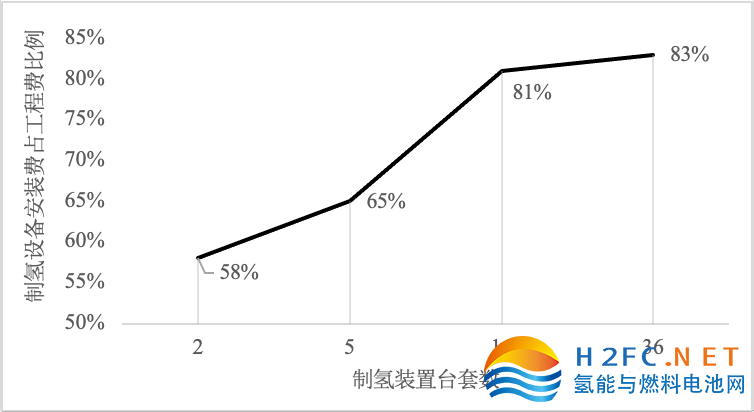 目前,1000Nm3/h電解槽(包括氣液分離器)設(shè)備費用在800萬——900萬元/臺;單套制氫設(shè)備的費用在1000萬——1300萬元,電解槽占制氫設(shè)備費用的比例為2/3左右;制氫工程費約占總投資的2/3。隨著臺套數(shù)的增加,設(shè)備及安裝費占工程費用的比例逐漸增大,如圖3所示。