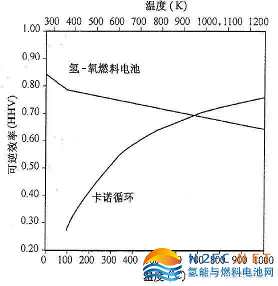 從這個角度,溫度越高,開路電壓越低。(對熱量來說,溫度越高,熱量品級越高。更高溫度的反應生成水,代表了排出更高品級的熱量)溫度越高,可逆熱效率越低。(談到效率,必然有能量損耗,此處的能量損失指的是熵)