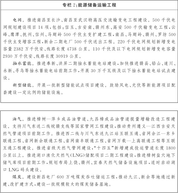 電力方面。加快融入華中特高壓主干電網,推進南昌至長沙、南昌至武漢特高壓交流工程建設,“十四五”新增特高壓交流變電容量600萬千伏安、線路800公里左右。堅持網源統籌、協調發展,繼續完善500千伏骨干電網建設,構建形成“1個中部核心雙環網+3個區域電網”①主干網架,“十四五”新增變電容量1075萬千伏安、線路長度285公里。持續優化220千伏電網,加快實施500/220千伏電磁環網解環,降低電網運行風險。強化配電網建設,實施農網鞏固提升工程,持續提升供電能力和電能質量。加強電力調峰能力建設,力爭核準建設抽水蓄能電站4座以上,并為中長期發展儲備一批站址資源。加快風電、光伏發電與新型儲能融合發展,建設一批集中式電化學儲能電站,探索開展其它形式儲能示范。(①“1個中部核心雙環網+3個區域電網”:指永修—夢山—錦江—安源—孔目江—羅坊—撫州—鷹潭—樂平—南昌—永修500千伏中部核心雙回環網和北部、東部、南部三個500千伏區域電網。)