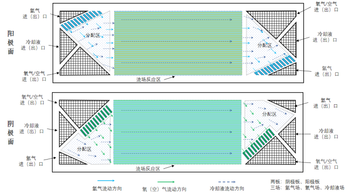 通常情況下雙極板由進出口、流場分配區(qū)及流場反應區(qū)組成。其中,進出口將氫氣、氧氣/空氣和冷卻液引入雙極板,為電化學反應提供工質,并通過冷卻液調整反應溫度;分配區(qū)主要將氫氣、氧氣/空氣和冷卻液均勻分配到流場反應區(qū)的流道中,為電化學反應一致性提供保障;流場反應區(qū)與膜電極均勻接觸,供給氫氣、氧氣/空氣。帶走反應產(chǎn)物,并進行電子及反應熱傳導,對結構一致性要求高。典型的雙極板結構圖如下所示: