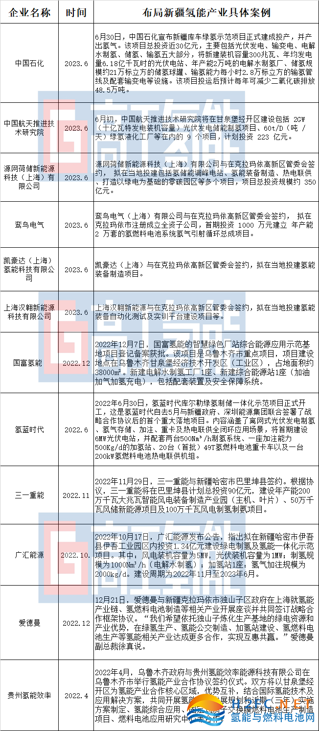 據不完全統計,國內已有中石化、國富氫能、氫藍時代、三一重工、廣匯能源、愛德曼、中國航天推進技術研究院、源網荷儲新能源科技等多家公司在新疆展開氫能產業布局,具體布局情況如下: