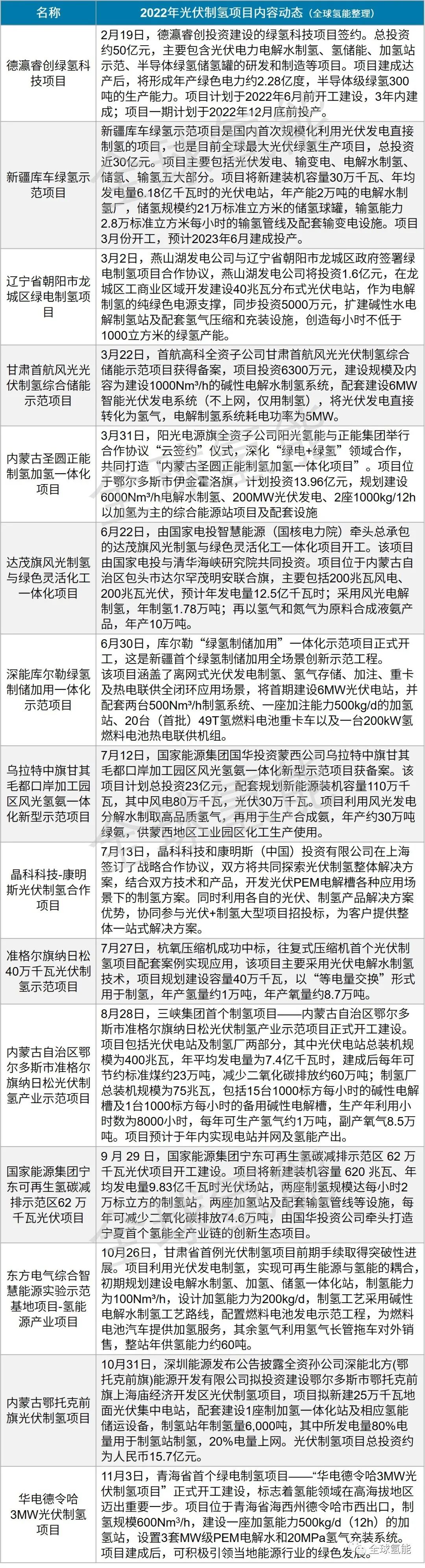 據不完全統計,我國目前在建和籌建的風電光伏制氫項目超過了40個,被專家認為發展前景廣闊。2022年,部分光伏制氫項目進展如下所示。
