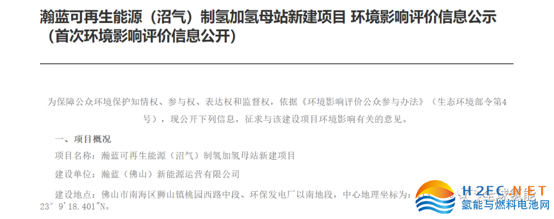 7月12日,瀚藍可再生能源(沼氣)制氫加氫母站項目新建項目環評公示。