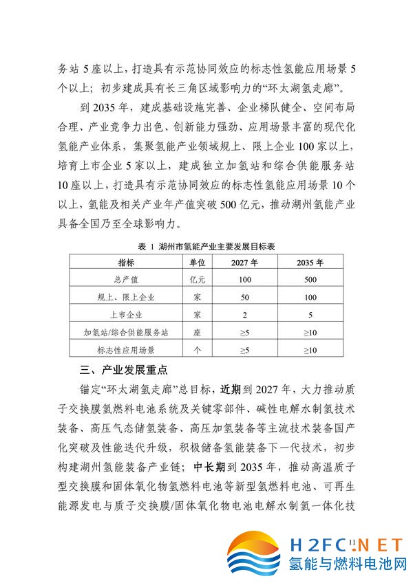 到2027年,培育和引進氫能產業相關領域企業50家以上,培育上市企業2家以上,發展初具規模;氫能及相關產業年產值突破100億元,形成具備湖州特色的產業鏈關鍵環節集聚;建成獨立加氫站和綜合供能服務站5座以上,打造具有示范協同效應的標志性氫能應用場景個以上;初步建成具有長三角區域影響力的“環太湖氫走廊”。