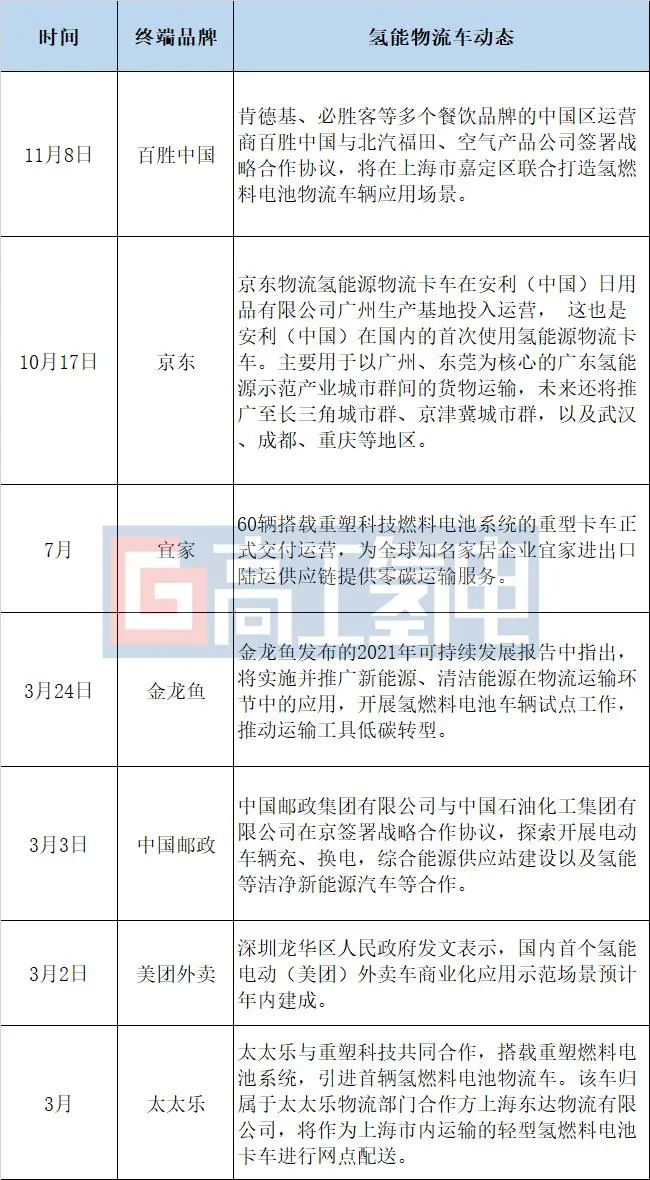 今年以來,肯德基、必勝客、京東、宜家、金龍魚、中國(guó)郵政、美團(tuán)外賣、太太樂等一眾知名終端品牌均公開了氫燃料電池物流車輛的投放應(yīng)用消息或落地計(jì)劃,助推氫燃料電池汽車用于城市配送、干線物流等應(yīng)用場(chǎng)景。