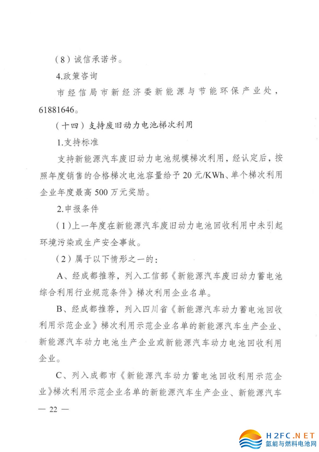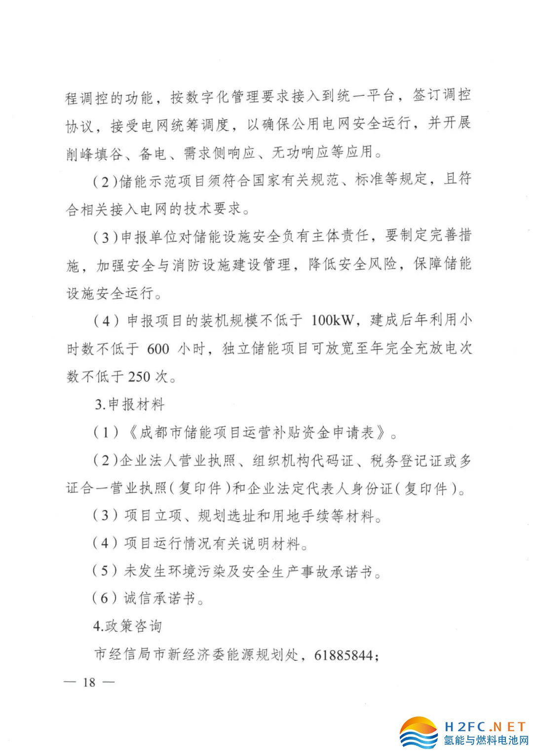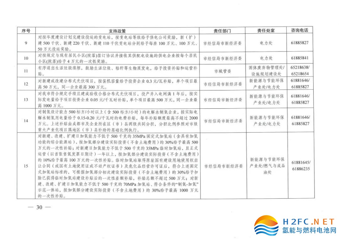 1、支持綠電制氫支持標準對制氫設計能力500標方/小時以上(含 500標方/小時)的電解水制氫企業,按實際電解水制氫用電量給予0.15-0.20 元/千瓦時的電費補貼,每年補貼額度最高不超過2000萬元。上述補貼由成都市及企業所在區(市)縣兩級共同分擔,分擔比例參照對市級重大產業化項目屬地區 (市) 縣補助的基礎比例執行。