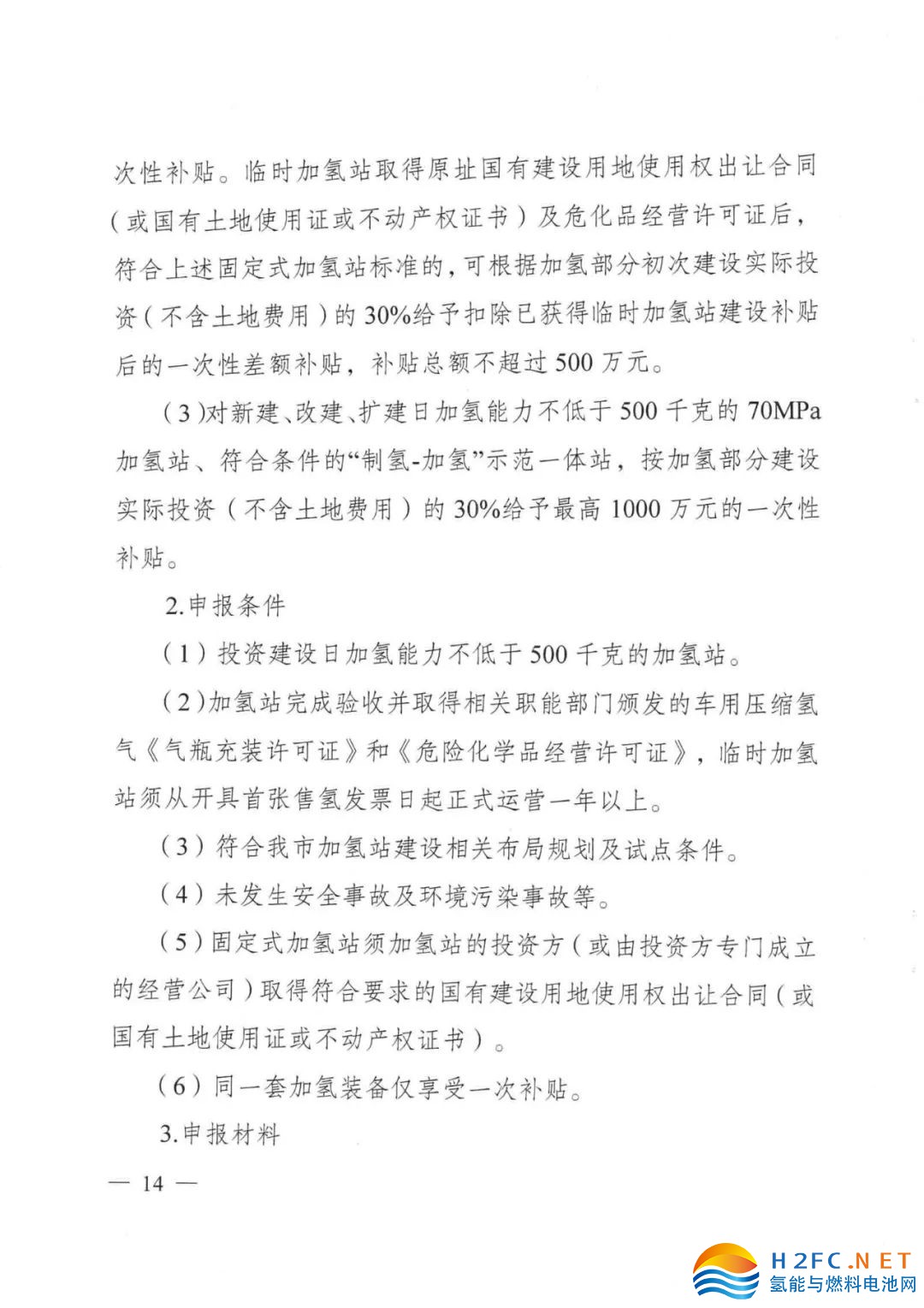 2、加氫站建設補貼支持標準(1)對新建、改建、擴建日加氫能力不低于500 千克的 35MPa固定式加氫站(含具有加氫功能的綜合能源站),按加氫部分建設實際投資(不含土地費用)的 30%給予最高 500 萬元的一次性補貼。(2)對新建日加氫能力不低于 500 千克的 35MPa 臨時加氫站,且正式運營(以首張售氧發票日期計)一年以上,按加氫部分建設實際投資(不含土地費用)的 10%給予最高100萬元的一次性補貼。臨時加氫站取得原址國有建設用地使用權出讓合同或國有土地使用證或不動產權證書)及?;方洜I許可證后符合上述固定式加氫站標準的,可根據加氫部分初次建設實際投資(不含土地費用)的 30%給予扣除已獲得臨時加氫站建設補貼后的一次性差額補貼,補貼總額不超過500萬元。(3)對新建改建擴建日加氫能力不低于500 千克的 70MPa加氫站、符合條件的“制氫-加氫”示范一體站,按加氫部分建設實際投資(不含土地費用)的 30%給予最高 1000萬元的一次性補貼。