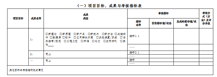 2.“考核指標(biāo)”,指相應(yīng)成果的數(shù)量指標(biāo)、技術(shù)指標(biāo)、質(zhì)量指標(biāo)、應(yīng)用指標(biāo)和產(chǎn)業(yè)化指標(biāo)等,其中,數(shù)量指標(biāo)可以為論文、專利、產(chǎn)品等的數(shù)量;技術(shù)指標(biāo)可以為關(guān)鍵技術(shù)、產(chǎn)品的性能參數(shù)等;質(zhì)量指標(biāo)可以為產(chǎn)品的耐震動(dòng)、高低溫、無(wú)故障運(yùn)行時(shí)間等;應(yīng)用指標(biāo)可以為成果應(yīng)用的對(duì)象、范圍和效果等;產(chǎn)業(yè)化指標(biāo)可以為成果產(chǎn)業(yè)化的數(shù)量、經(jīng)濟(jì)效益等。同時(shí),對(duì)各項(xiàng)考核指標(biāo)需填寫(xiě)立項(xiàng)時(shí)已有的指標(biāo)值/狀態(tài)以及項(xiàng)目完成時(shí)要到達(dá)的指標(biāo)值/狀態(tài)。立項(xiàng)時(shí)已有指標(biāo)值/狀態(tài)可填寫(xiě)“無(wú)”,若某項(xiàng)成果在立項(xiàng)時(shí)已有指標(biāo)值/狀態(tài)難以界定,則可填寫(xiě)“/”。