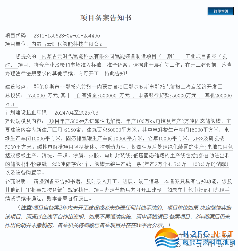1月15日,內(nèi)蒙古云時(shí)代氫能科技有限公司氫能裝備制造項(xiàng)目(一期)獲批,內(nèi)蒙古鄂托克前旗發(fā)展和改革委員會(huì)就該項(xiàng)目發(fā)布《變更項(xiàng)目備案告知書》。