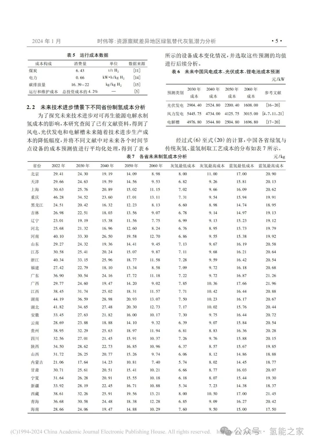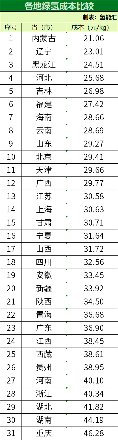 2024年第一期《現(xiàn)代化工》發(fā)表了《資源稟賦差異地區(qū)綠氫替代灰氫潛力分析》一文,對目前及未來各地不同地區(qū)綠氫成本進行了測算。從比較來看,目前北方制氫成本低于南方,尤其是內蒙、遼寧、黑龍江、河北、吉林五地制氫成本最低,而河南、浙江湖北、湖南、重慶則是成本最高。內蒙以21.06元/kg居成本最低,重慶則比其2倍還要高,達到46.28元/kg。