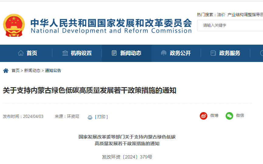 2024年4月3日,發(fā)改委、工信部、自然資源部、生態(tài)環(huán)境部、能源局、林業(yè)局等六部門聯(lián)合發(fā)布《關(guān)于支持內(nèi)蒙古綠色低碳高質(zhì)量發(fā)展若干政策措施的通知》。